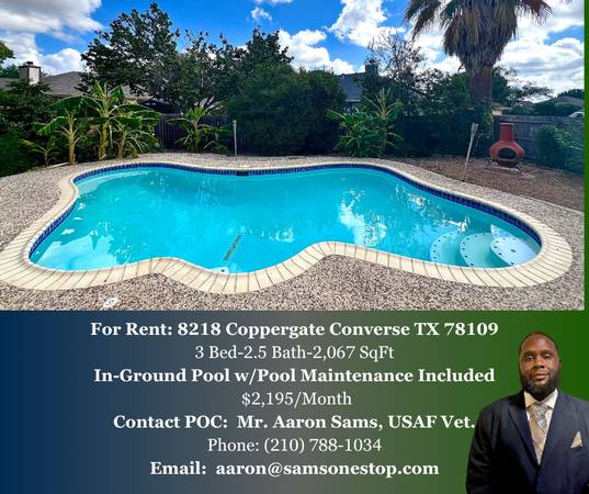 3 bedroom home available with flexible screening criteria related to credit and background. No HOA! This home features an outdoor oasis with an in-ground pool with pool maintenance included in the rental price. Master Bedroom is located on the first floor with a walk-in closet and an exit/entry door to the backyard pool. Master Bathroom features dual vanities, and a separate tub and walk-in shower. Open floor plan with over 2,000 SqFt of living space! Upstairs features a spacious loft that can be used as a study/office or as a game room for additional family entertainment. Remaining two bedrooms are located upstairs with an additional full bathroom. Laminate floors throughout the home with carpet only on the stairs. Home is conveniently located close the Forum, Joint Base San Antonio-Randolph, and Joint Base San Antonio-Ft Sam Houston. No pets allowed. This home is available to tenants with a combined household income of at least $6,500 per month.