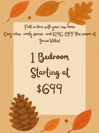 Fall in love with your new home at Torino Villas Apartments! Our 2 bedroom, 1 bathroom apartment offers 874 sq. ft. of comfort, style, and convenience β perfect for relaxing and enjoying the season.
