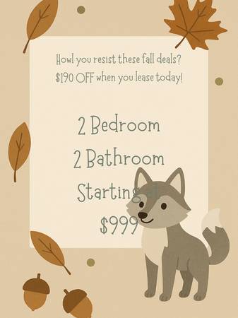 Cozy up this season in your new home at Torino Villas Apartments! Our beautiful 2 bedroom, 2 bathroom apartment offers 979 sq. ft. of comfort and convenience β perfect for relaxing or entertaining this fall!