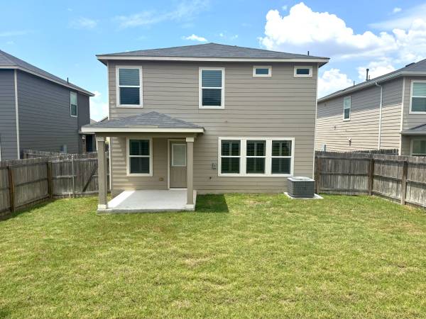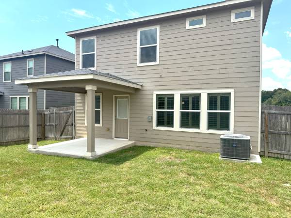 Tucked away on a peaceful cul-de-sac with no neighbors in front or behind, this beautiful 2-story home combines privacy, comfort, and convenience in one perfect package. Offering 2,242 sq. ft. of well-designed living space, the home features 4 spacious bedrooms, 2.5 baths, and an open-concept layout that's brightened by natural light and accented with elegant plantation shutters throughout. The heart of the home is the modern kitchen, showcasing granite countertops, an electric stove, a breakfast bar, and plenty of cabinet space. All kitchen appliances, along with the LG ThinQ washer and dryer, are included in the rent-making this home truly move-in ready. The adjoining living and dining areas open to a covered patio, ideal for hosting friends or enjoying quiet evenings outdoors. Upstairs you'll find a versatile loft space and four generous bedrooms, each with walk-in closets. The primary suite offers a relaxing retreat with its oversized walk-in shower and rain shower head. Additional features include a water softener, LG French door refrigerator, 2 extra thermostat sensors, and a full sprinkler system to keep the yard green year-round. Situated within walking distance to the community pool and park, and just minutes from Hwy 211 and Hwy 90, this home offers both convenience and comfort. With thoughtful upgrades, included appliances, and a prime location, this rental is a rare find.