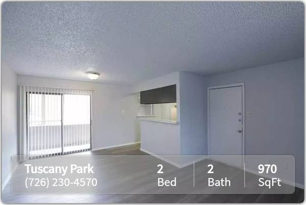 Description........ Here at Tuscany Park Apartments, you'll experience peaceful living with all the best in location and comfort. Just minutes away you will find great shopping, dining, and entertainment options, including SilverHorn Golf Club, Six Flags Fiesta Texas, Alon Town Center, Marshalls and HomeGoods, India Oven, Ruthie's Mexican, and Las Palapas! Tuscany Park Apartments is situated near several area schools and employers, including Larkspur Elementary, Eisenhower Middle, Winston Churchill High, UT Health San Antonio, Troy University, Strayer University, DeVry University, Webster University, Hallmark University, San Antonio International Airport, H-E-B, Black Rifle Coffee, USAA, Methodist Healthcare Systems, Joint Base San Antonio, Randolph Air Force Base, Wells Fargo, JP Morgan Chase, and Rackspace Event Center. Our top-notch location off of Highway 281 and Interstate 410 also gives you easy access to all areas of the city.