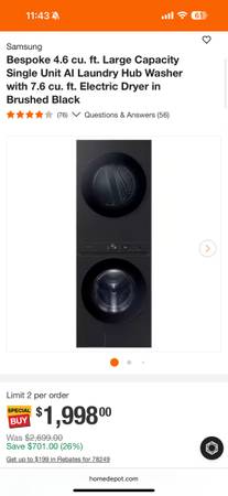 Samsung Bespoke 4.6 cu. ft. Large Capacity Single Unit Al Laundry Hub Washer with 7.6 cu. ft. Electric Dryer in Brushed Black $1,299