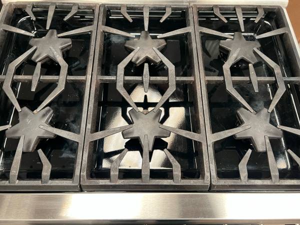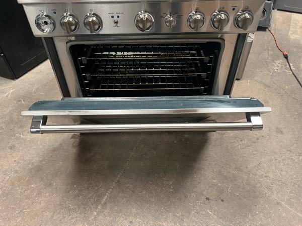 Up for sale I have a Thermador 36” 6 burner gas professional style range. Model number is PRG366GH. It features convection cooking and multiple telescoping cooking racks. Guaranteed working. Serious inquiries only. MSRP for this range is $8699 plus tax. I have the other knob. One knob is not shown due to cleaning it.