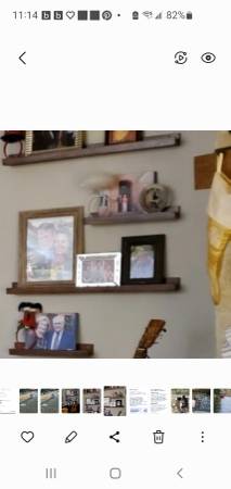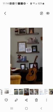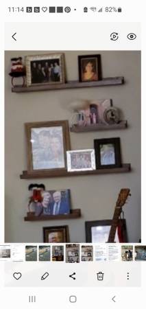 Five Alder wood floating picture, art, or display ledges for sale. Finished in Walnut stain. Three ledges are 36" long and two ledges are 18" long.