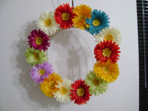 LOT OF FOURTEEN (14) NEW UNUSED DAISY GERBERA CLIP-ON 4 1/2" ROUND FLOWERS WITH ORIGINAL MANUFACTURER'S TAGS. ARTIFICIAL SILK, ASSORTED COLORS: 3 YELLOW, 3 RED, 3 WHITE, 2 LIGHT GREEN, 1 BLUE, 1...