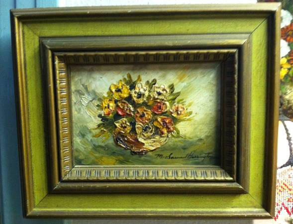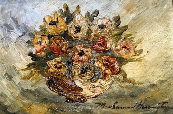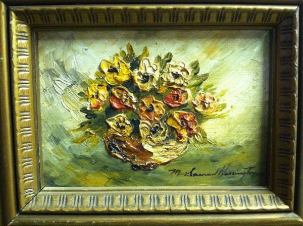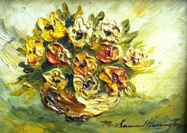 LISTED ARTIST who's paintings sell for over $2000 Reasonable offers will be considered. Flowers in a Pot c .1980's Original oil painting on board - impasto Signed by Margie Samuel Harrington In...