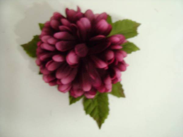 LOT OF SEVENTEEN (17) ASSORTED COLORS OF ARTIFICIAL SILK 4 1/2" x 2 1/2" CLIP-ON MUMS/GREEN LEAVES WITH ORIGINAL MANUFACTURER'S TAGS. 4 WHITE, 3 PURPLE, 6 DARK RED, 4 ORANGE. FROM A SMOKE-FREE HOUSE.