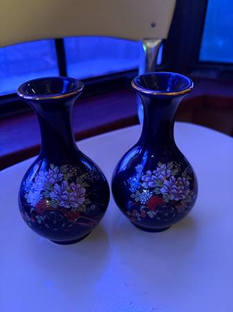 Two Japanese Kutani Porcelain ware vases, known for its vivid painterly overglaze decoration using 5 specific colors, red, blue, yellow, green and purple - Deep cobalt blue background with floral motifs and traditional cart wheel design - No chips - 4 1/2 inches tall - $35 for both - See Pic 2