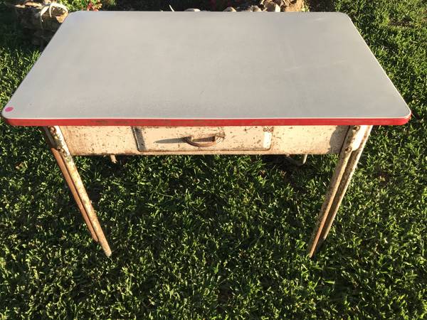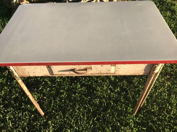 Item great for a gift: Red/white Porcelain table - 39 3/4 x 24 3/4 inches and 28 1/4 inches tall - White top with red edges - White sides - $174 - see pics