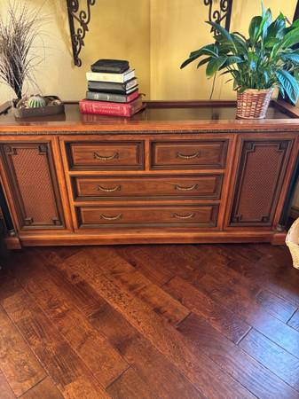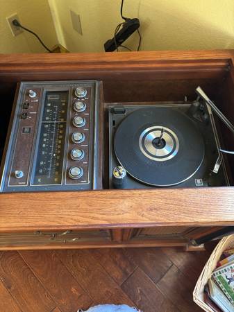 It works!!!The Magnavox Stereo Console Record Player Turntable Radio from the 1960s is a vintage piece of antique furniture that serves as both a functional record player and a stylish am/fm console. Made in the United States by Magnavox, this unit combines the nostalgia of a retro stereo console. The Magnavox brand is known for its quality and durability, making this piece a standout addition to any vintage collection or modern home. It has 3 speeds: 33rpm, 45rpm and 78rpm. The automatic swing arm stacks up to 5 vinyl albums to automatically play in succession. There are separate bass and treble controls and tuning controls. Dimensions = 50wide x 24high x 17.25deep.