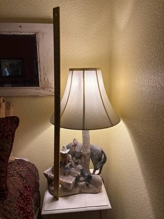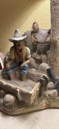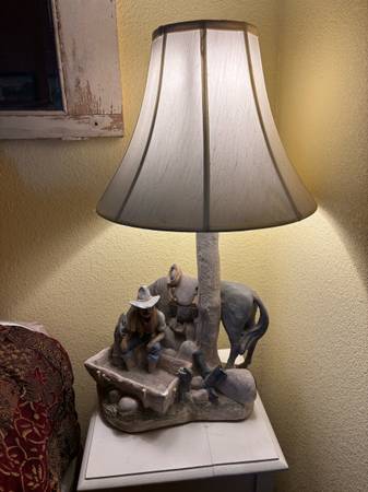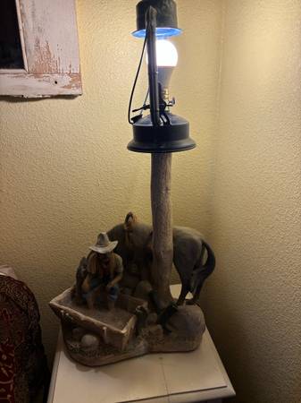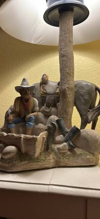 Vintage Western Cowboy Lamp – Unique rustic table lamp featuring a detailed sculpted scene of a cowboy resting beside his horse under a tree trunk post. Perfect for a ranch, cabin, or Western-themed room. A functional light and eye-catching conversation piece.