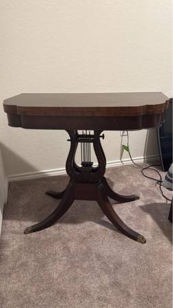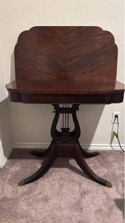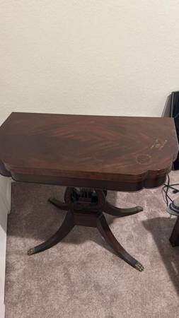 Antique Mahagony flip top table. Fold in half and lies down to make a nice decorative/ hall table or game table. Some light scratches which is normal due to its age! Selling cheap to make room for...