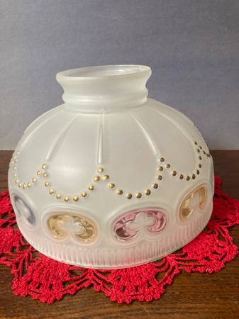 Beaded drape 10” glass shade with hand applied red, blue, and amber iridescent fleur des lis colored panels and gold beading is also available separately, $40.