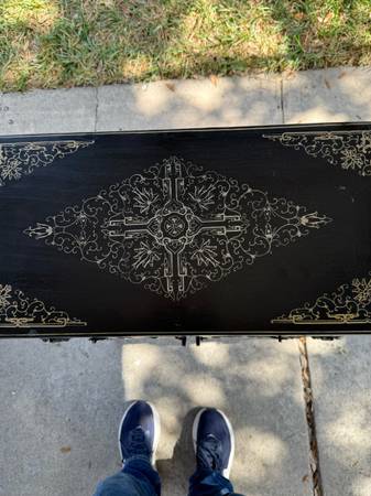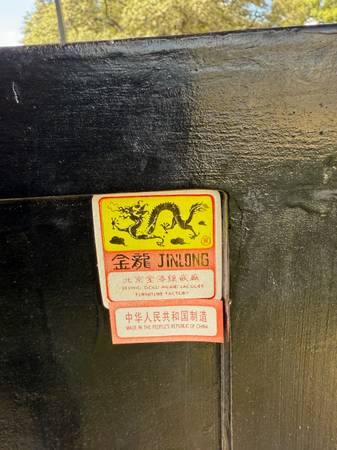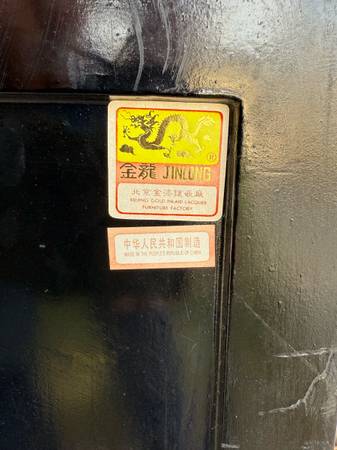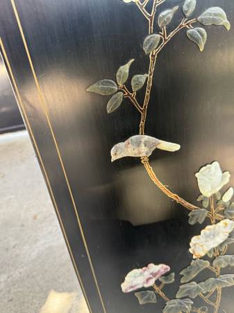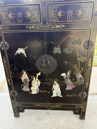 Chinese black lacquer cabinets with inlaid figures. decorated with intricate hand-painted gold accents and mother-of-pearl or hardstone inlays.
