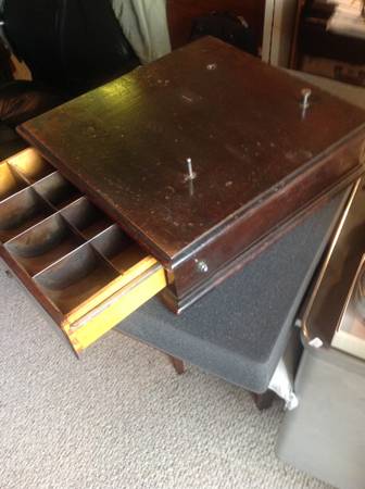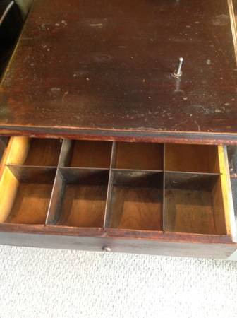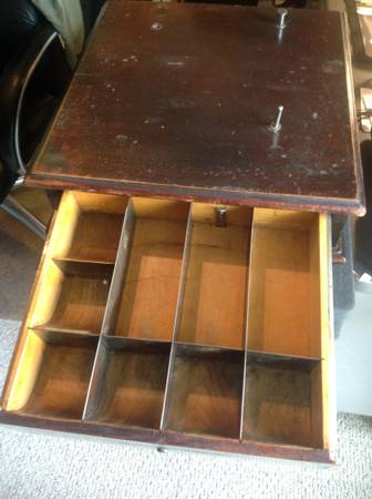 Antique Wooden Cash Drawer from old general store, etc. Fully functional and excellent condition. Manufacturer plate on bottom say model "L". Bell dings when drawer is opened. Removable pin on top to hold old store log, paperwork, etc. Really great condition given its age. Would be a great addition to a retail store, retro, antique, vintage, etc. $185 OBO.