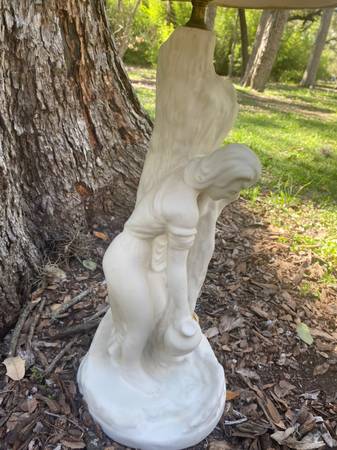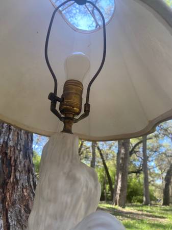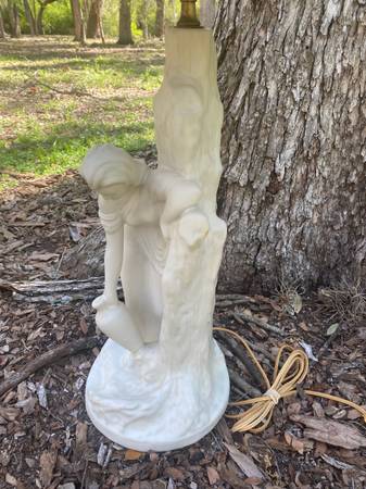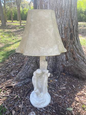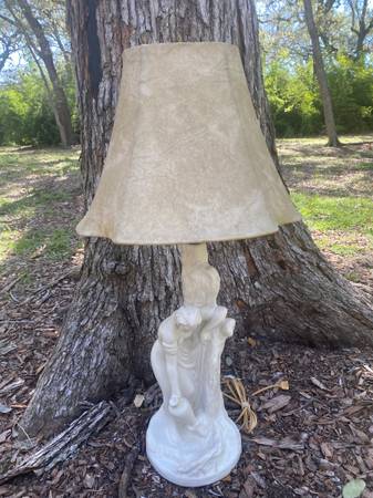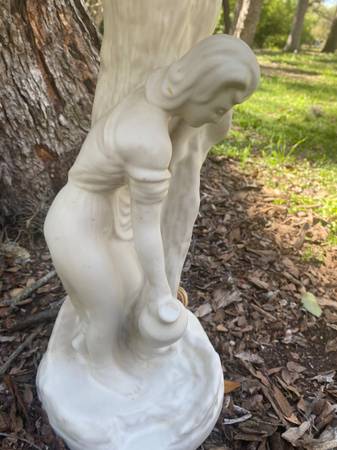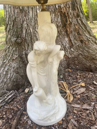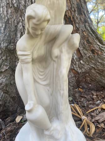 Elegant Van Briggle sculpture depicting “Rebecca at the Well” finished in a creamy matte white glaze. The base has the Van Briggle logo. Lamp includes harp, finial, and beige shade.