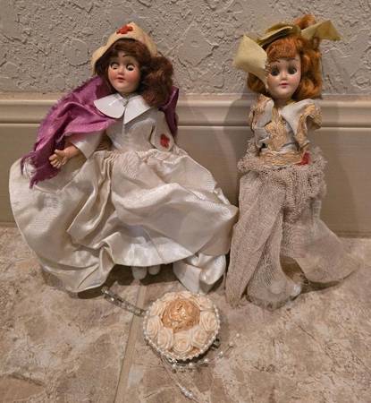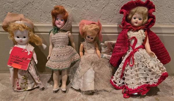 ~ 1 small doll is missing an arm, and another small doll is missing both arms. Otherwise, to be as old as they are, they are in good condition