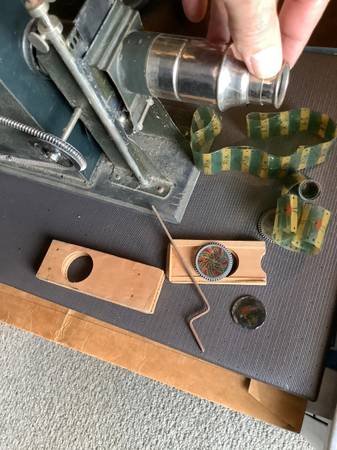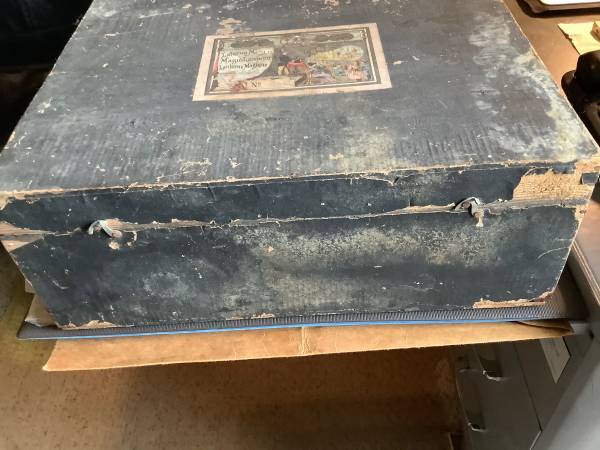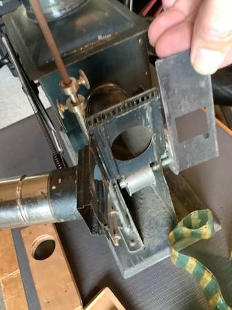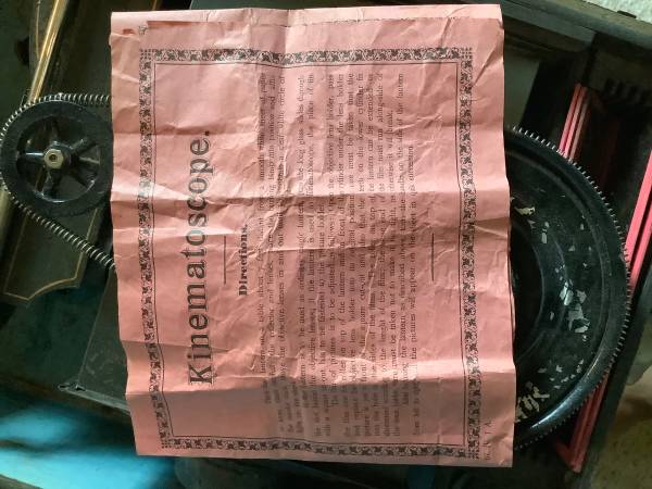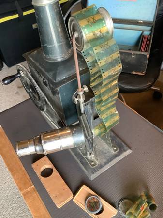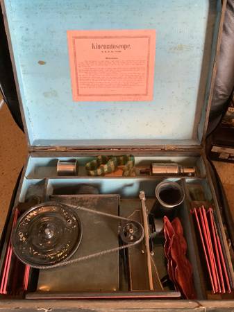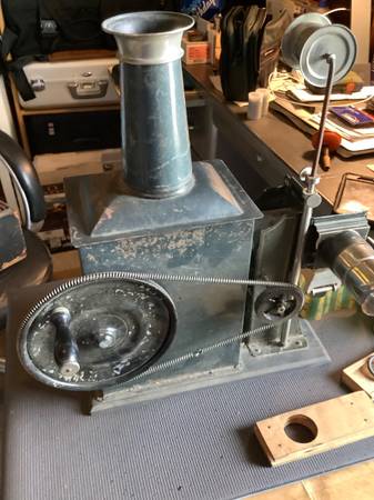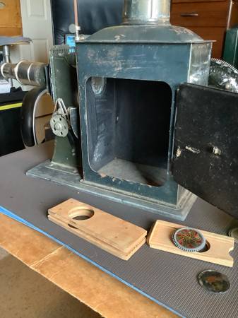 Magic Latern - Kinematoscope. 1900-1905 Magic Lantern with all parts in original wooden box. Extra slide plates, circular transparencies and film strip are included. Works as intended. Very had to find in this original condition with extras. $225 OBO.