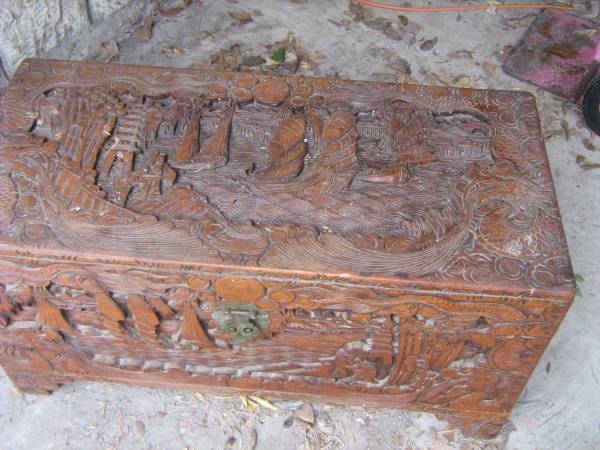 Beautiful hand-carved chest. Crafted in S.E. Asia in mid 1940s. Dimensions; 32 inches long, by 15 inches wide, by 16 inches high.