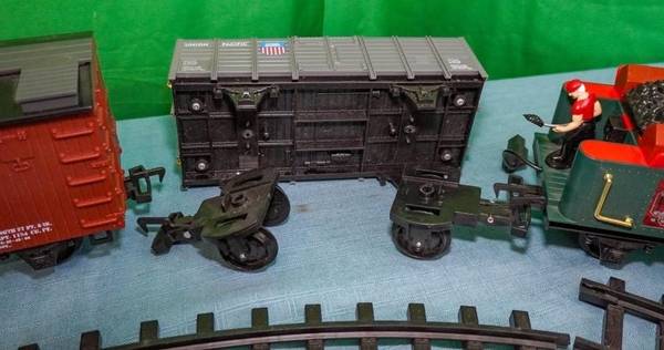 The train is carefully packed and in good working condition. One boxcar needs screw(s) to hold it to the wheel (see image).