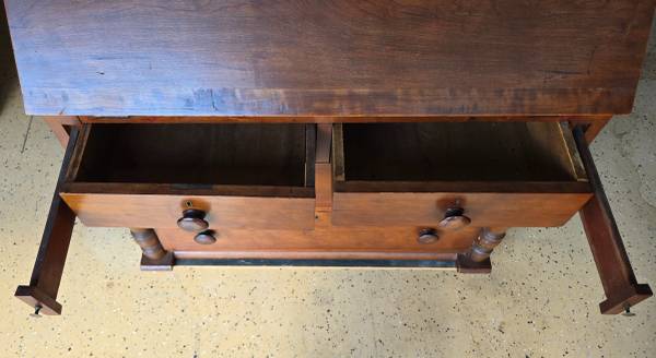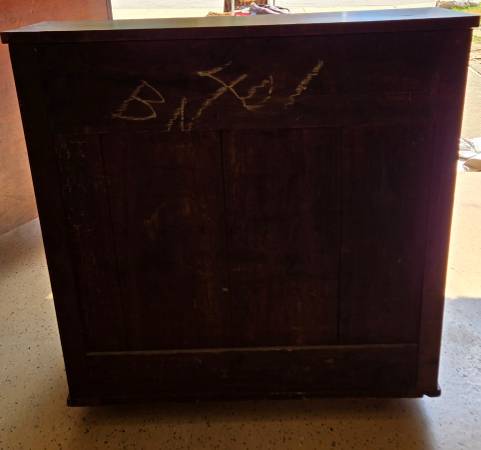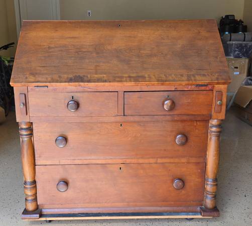 Secretary from the 1800's. Good condition. Legs have been removed and is on a roller board. Made with wooden pegs and wrought nails. Solid wood.
