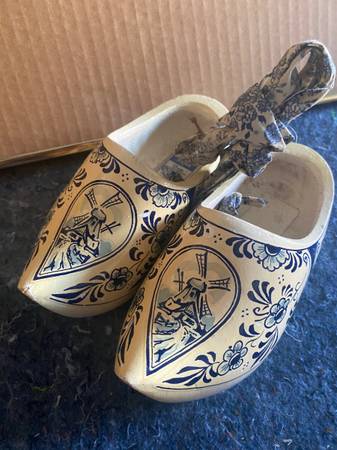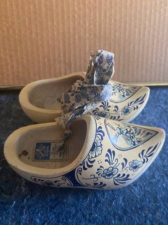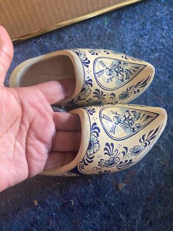 Call or text me if interested in buying today TwoOneZero- 664 - 7217 Set of 2 Vintage Junora Holland Dutch Yellow & Blue Wooden 6” Shoes Clogs $20 Local Pick up or Shipping Available ($30...