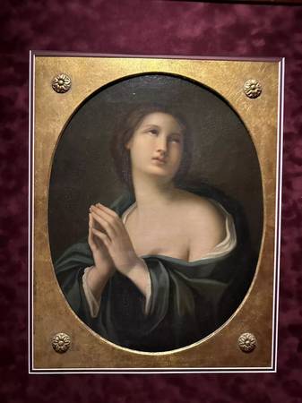 A very pretty and stunning oil painting, it is 19th century, so very old, has a gorgeous solid wood frame in a gold gilt finish. Its large
