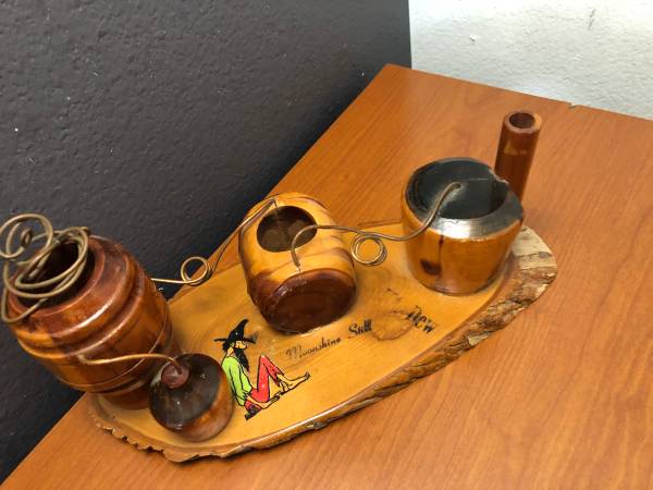 Call or text when ready to purchase TwoOneZero-300-1759 Vintage Boone North Car Moonshine Still Jug Wood Decoration Made in USA Measures 13” wide 7” tall $50 Pick up anytime or Shipping Available...