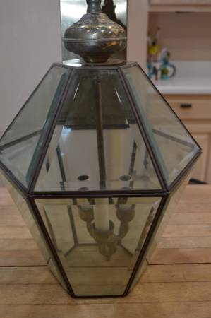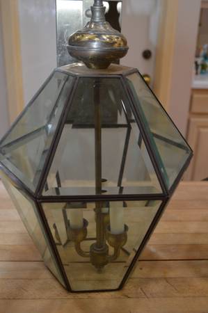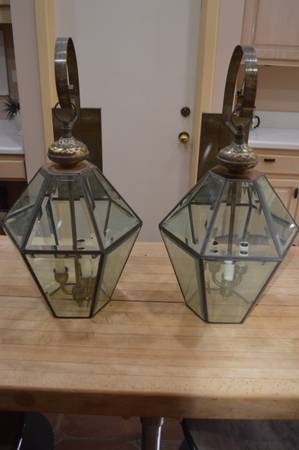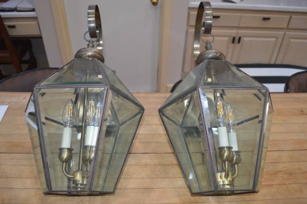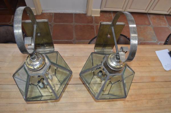 VINTAGE BRASS BEVELED GLASS WALL SCONCES WITH BULBS. THREE LIGHT IN EACH. SCONCE IS 13 1/2", TOTAL WITH HANGER IS 23". HAS BEEN IN STORAGE FOR 25 YEARS.