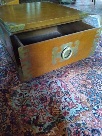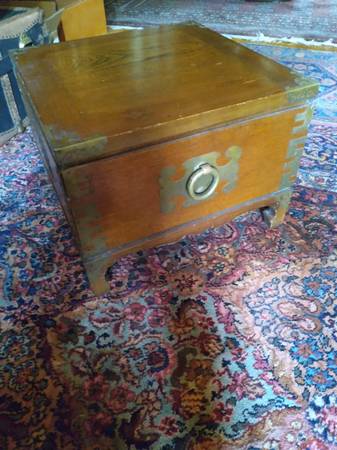 18" X 18" X 13.5" height. It has a secret drawer. Brass and wood.