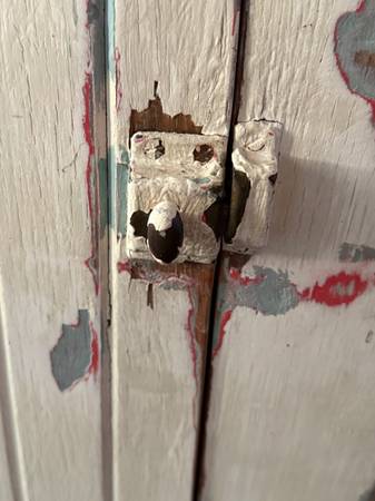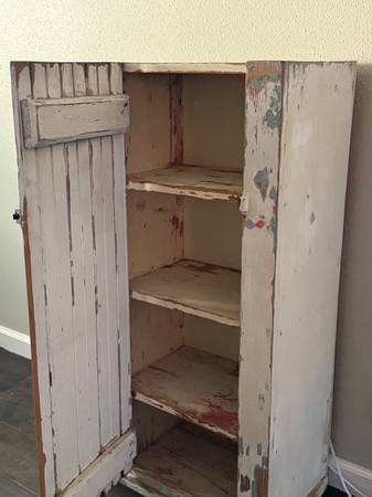 Sturdy handmade cabinet from an old farmhouse. It is about 100 years old. Distressed painted wood.