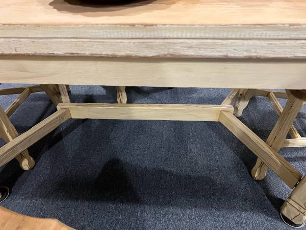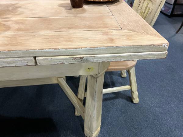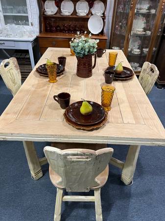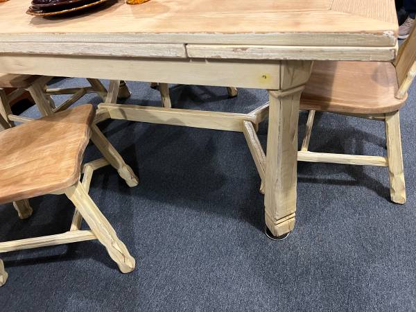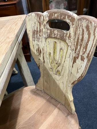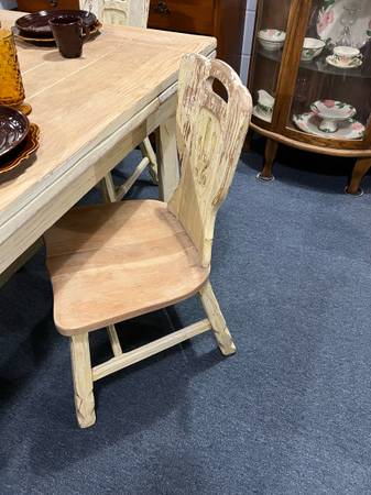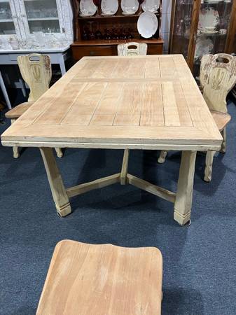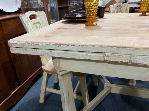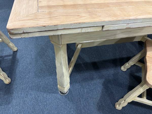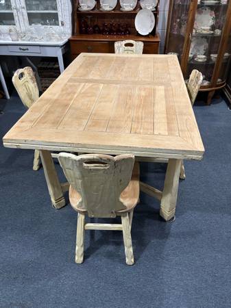 This is a gorgeous table and chair set. Table extents. Very heavy and the design on the chairs is just stunning. The previous owner painted it but it is normally a natural color. There is a leg on the table that needs to be righted but is stable along with all four chairs.