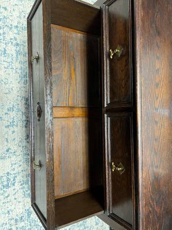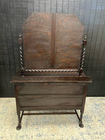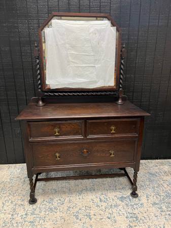 Beautiful vanity/dresser twisted design style. All wood has normal wear for its age. No broken drawers or mirror, very clean.