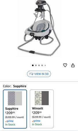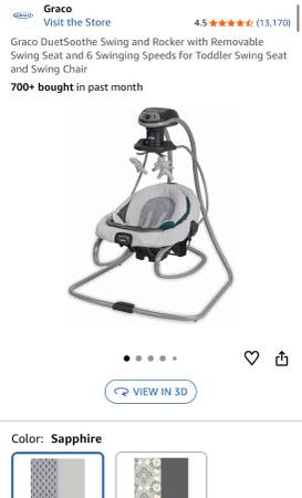 Used but in great condition: Baby Delight Beside Me Dreamer Bassinet | Bedside Sleeper | 6-Position Height Adjustment | Driftwood Grey ($75.00) and/or Graco DuetSoothe Swing and Rocker with Removable Swing Seat and 6 Swinging Speeds for Toddler Swing Seat and Swing Chair in color Sapphire ($75.00). The bassinet I have two mattress covers as well as two sheets. You can get both or one just let me know. Can meet at a Starbucks if interested.