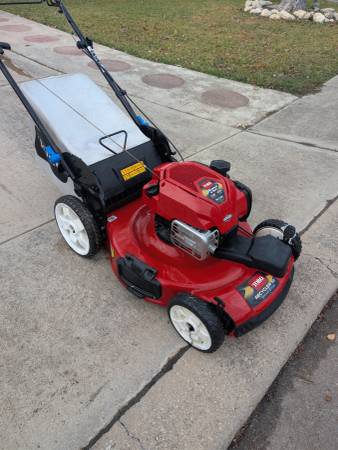Practically new Toro self propelled mower with grass catcher high rear wheels machine starts right up and it runs strong save big money calls only no email no text
