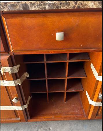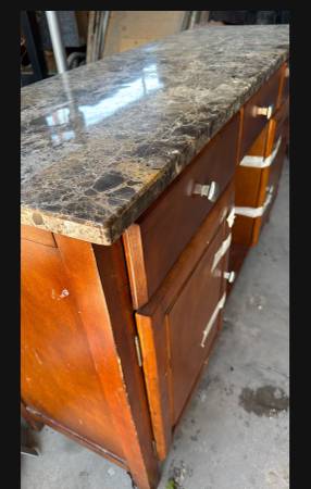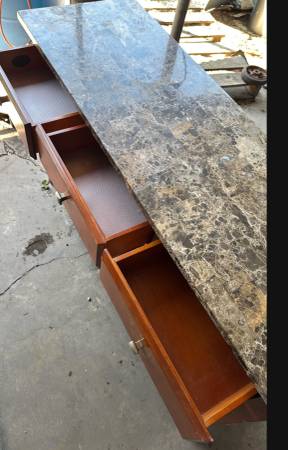 Buffet w/ wine rack Marble top SOLID no chips or cracks 56 inn L 18 in D 34 in H A few scuffs Nothing major All drawers work MPU Cash Only