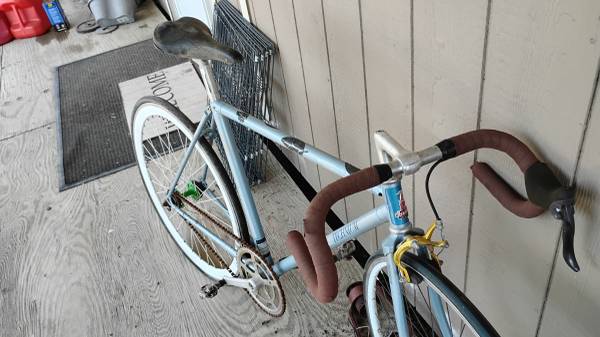 Intact but not ready to ride needs new wheels , brakes, etc. Is a fix gear ,. Classic bike, light weight .