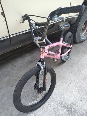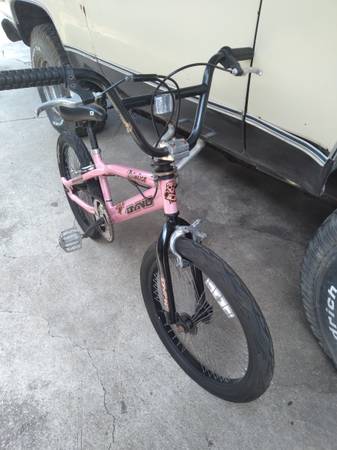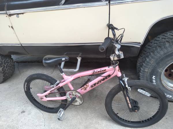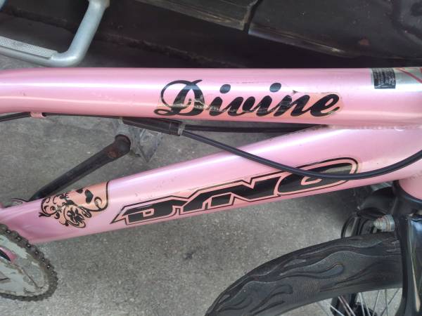 Selling one 20 INCH DYNO DIVINE BMX BIKE/2008 MODEL. The bike features an oval-tube Freestyle Frame with the factory original Pink Paint Job. The DYNO DIVINE has a sturdy Hi-ten fork and highly maneuverable two-piece Freestyle handle bar. The Freestyle brake rotor system provides sure stopping power. The bike has the original factory 48-spoke alloy rims, that run true. The bike is still in great condition and it's all original except for the Head, it's off a MONGOOSE BIKE. The asking price is $100.00. If interested, please call or text for more information. Thanks for looking.