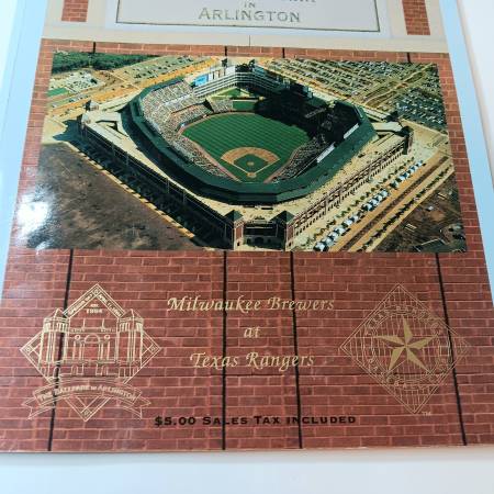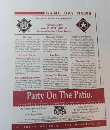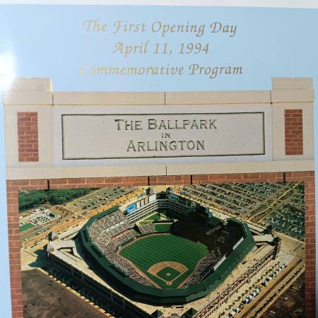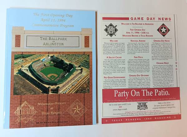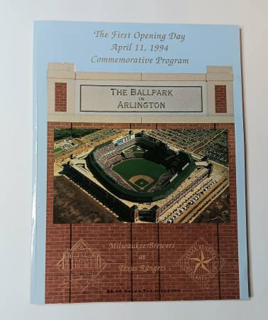 I have the following Program for sale. $10.00 The Ballpark at Arlington Stadium The First Opening Day April 11, 1994 Commemorative Program Texas Rangers vs. Milwaukee Brewers *Also included - Game...