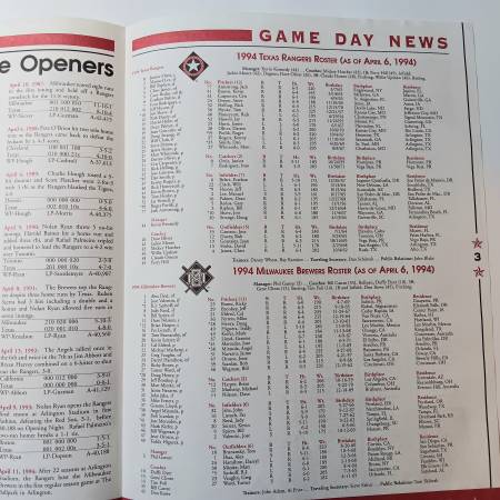 Arlington Stadium Opening Day Program April 11 1994 Rangers Brewers...