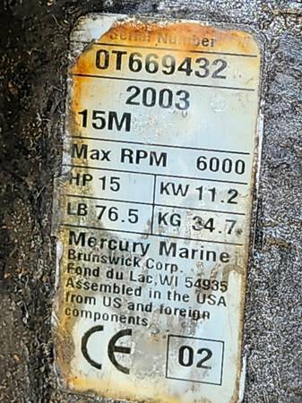 2003 Mercury 15HP outboard motor. The motor is 2-cycle and has a new water pump. The motor starts easy and runs great. $1000 or best offer.