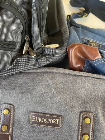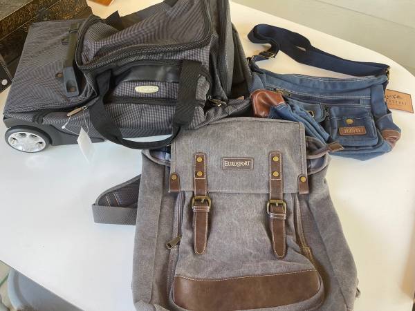 3 brand new bags. Duffle bag w/ wheels. Large backpack. Small travel bag. Retail Price = $160 Save = $100