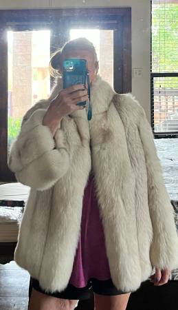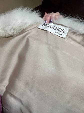 Grosvenor (Canada) Lynx dyed Norwegian Fox coat in excellent condition. Fold down collar Hook and loop closure. Tan satin lining is in great condition except one small spot. Fur has no shedding or balding. It has been well taken care of and stored in a hanging dust bag.