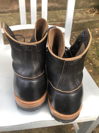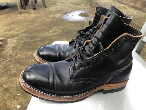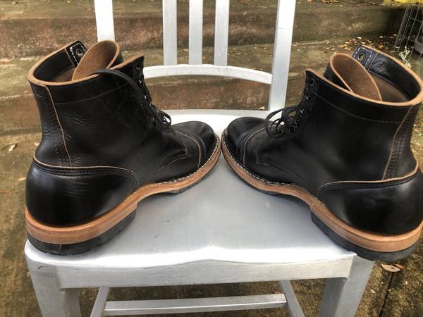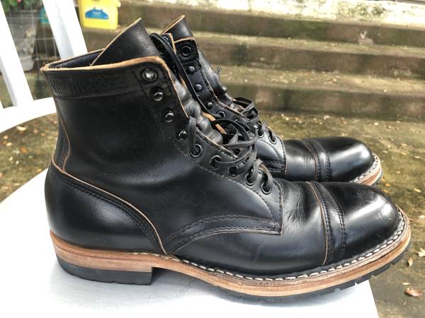 This is a used pair of boots and there is a small amount of wear on the heels, and there is some slight nicks in the leather. According to the forums online the leather is meant to show the scratches naturally to show wear (known as patina). My instinct is to lightly polish the scratches with a bit of shoe polish, but I will leave that decision up to the buyer.