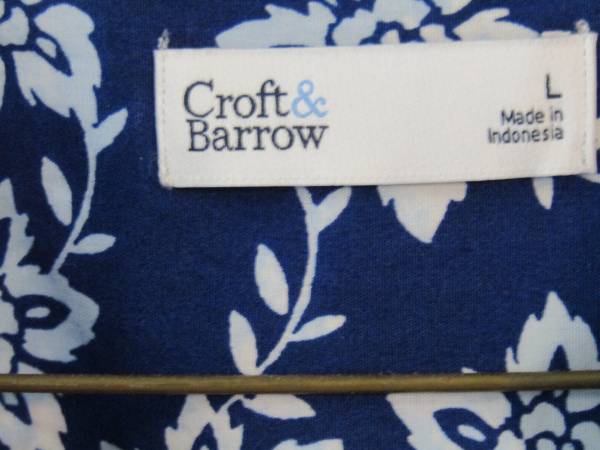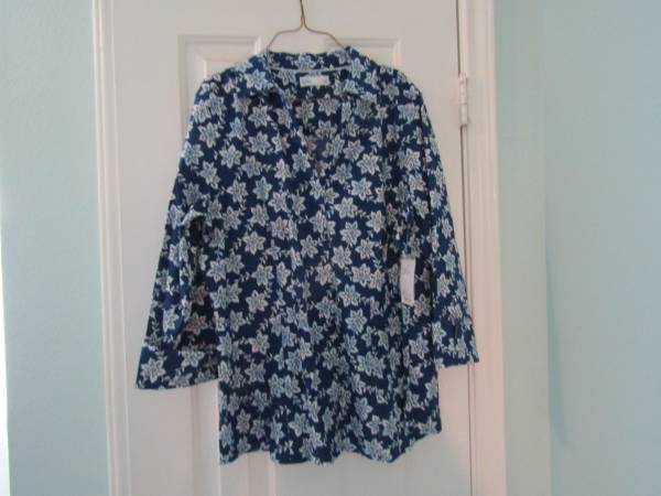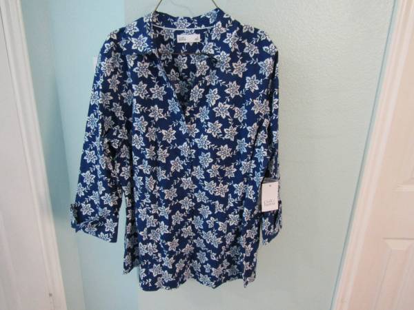 Croft & Barrow Women's Cotton Blouse. Dark blue flower print. Size Large. 3/4 cuffed sleeves. Hidden buttons. Spare button included. New, never worn or washed. Cash only.
