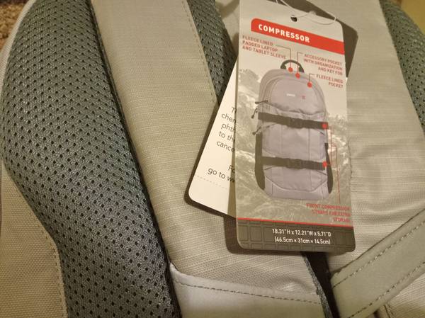 Large main compartment .. Front compression straps for extra storage .. Large front accessory pocket with org and key fob ..
