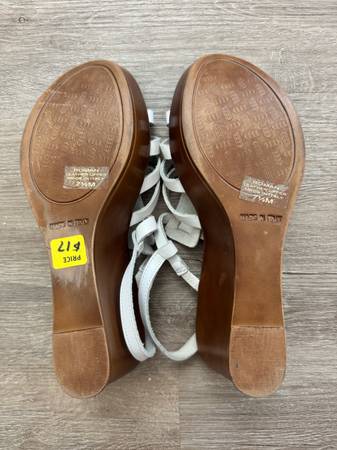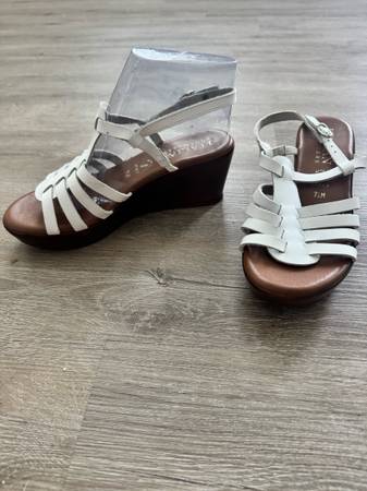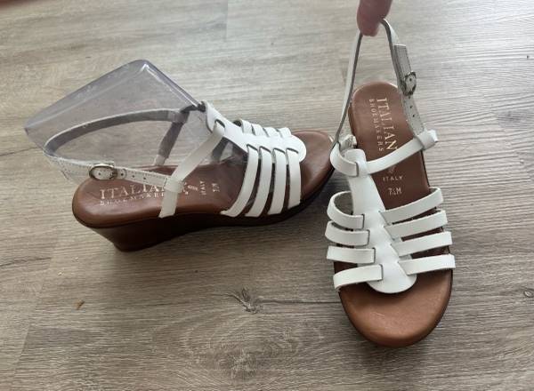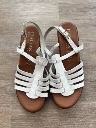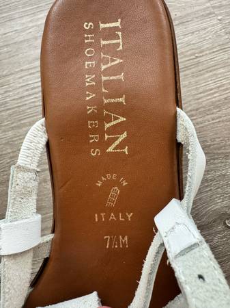 Elevate your style with these Italian Shoemakers slip-on wedge sandals. Crafted in Italy with genuine leather, these strappy sandals feature a comfortable mid-heel height, cushioned insole, and buckle closure for a secure fit. Perfect for any occasion, whether it be a casual day out or a night of dancing, these sandals come in a stylish white color and are versatile enough to pair with any outfit.