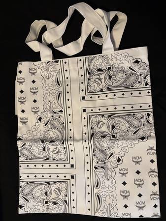 This authentic MCM tote is brand new and never used. Features a bold white and black bandana print design, with sturdy shoulder-length straps for easy carrying.