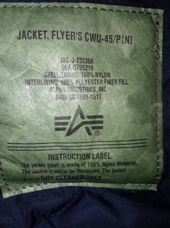 ( NEW) :CWU 45/P Flight Jacket was first issued to Air Force and Navy pilots. It is constructed with a 100% mid-weight flight nylon shell. It also features a a fold down collar. Bonus Features: This authentic flight jacket has a utility pocket on the sleeve with a signature “Remove Before Flight” flag. There are also 2 lower flap pockets and 1 interior patch pockets. The patch is Velcro and is removable to facilitate any patch or customized name or agency badge .The shirred sleeves and extra-thick knit rib cuffs and waistband give this jacket the authentic bomber look.