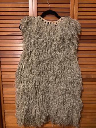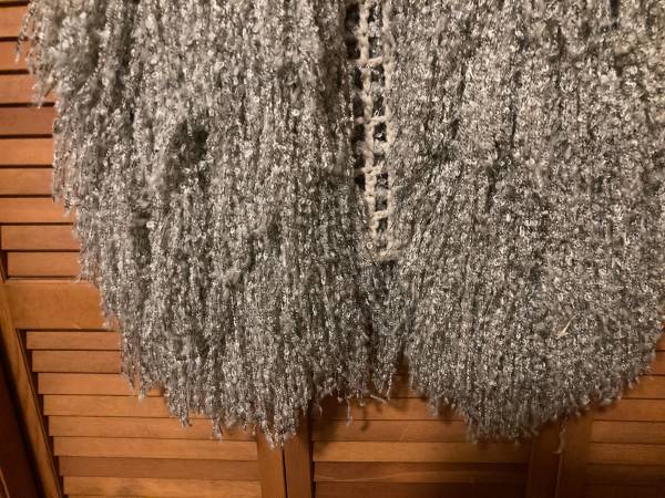 $10. new, perfect condition. size L. Just clearing out closets. measures about 36" long from should to hem, x 40" across bottom width. Beautiful black, grey, pearl color acrylic crocheted threads....